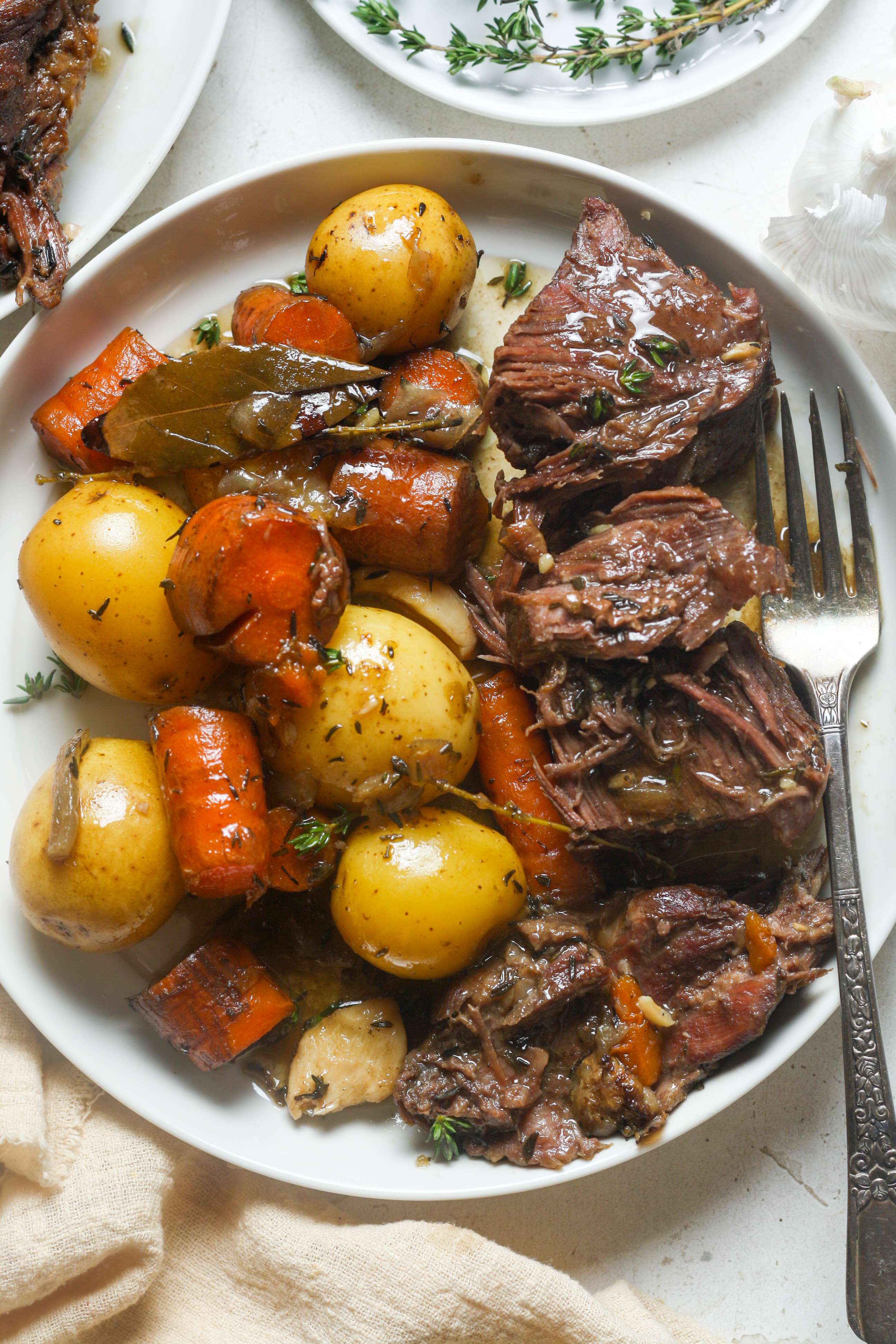 - Then, add in the carrots and potatoes around the edges of the meat. Place the lid on top. Bake for another 90 minutes to 2 hours, until veggies and meat are tender.