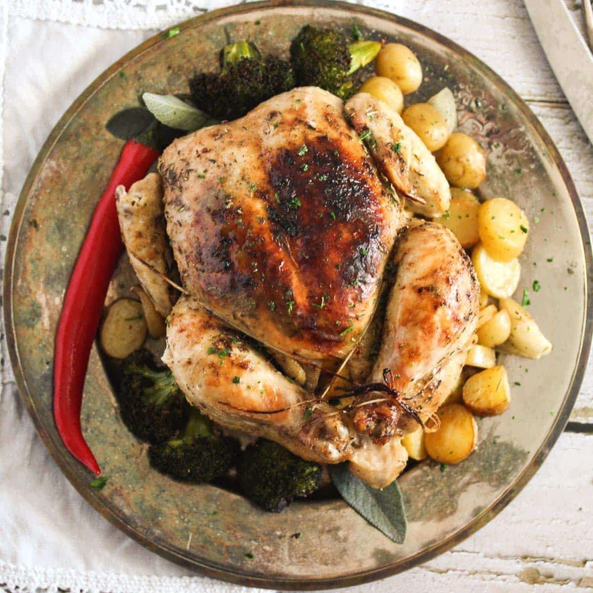 - If desired, you can stuff the chicken with one halved lemon or onion and/or some fresh herbs like parsley, thyme, or rosemary.