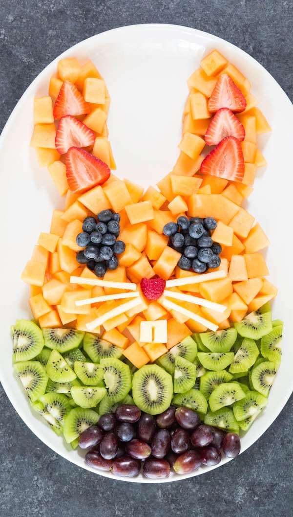 Fresh fruits arranged in a bunny shape to make an adorable Easter fruit tray.