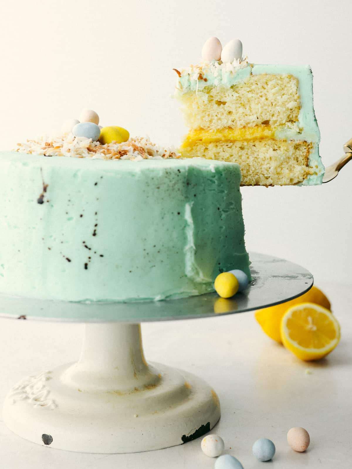 This Easter cake is absolutely divine! A perfectly moist cake with a lemon curd filling and a delicious buttercream frosting will be sure to get a "WOW!" From all of your guests this Easter season!