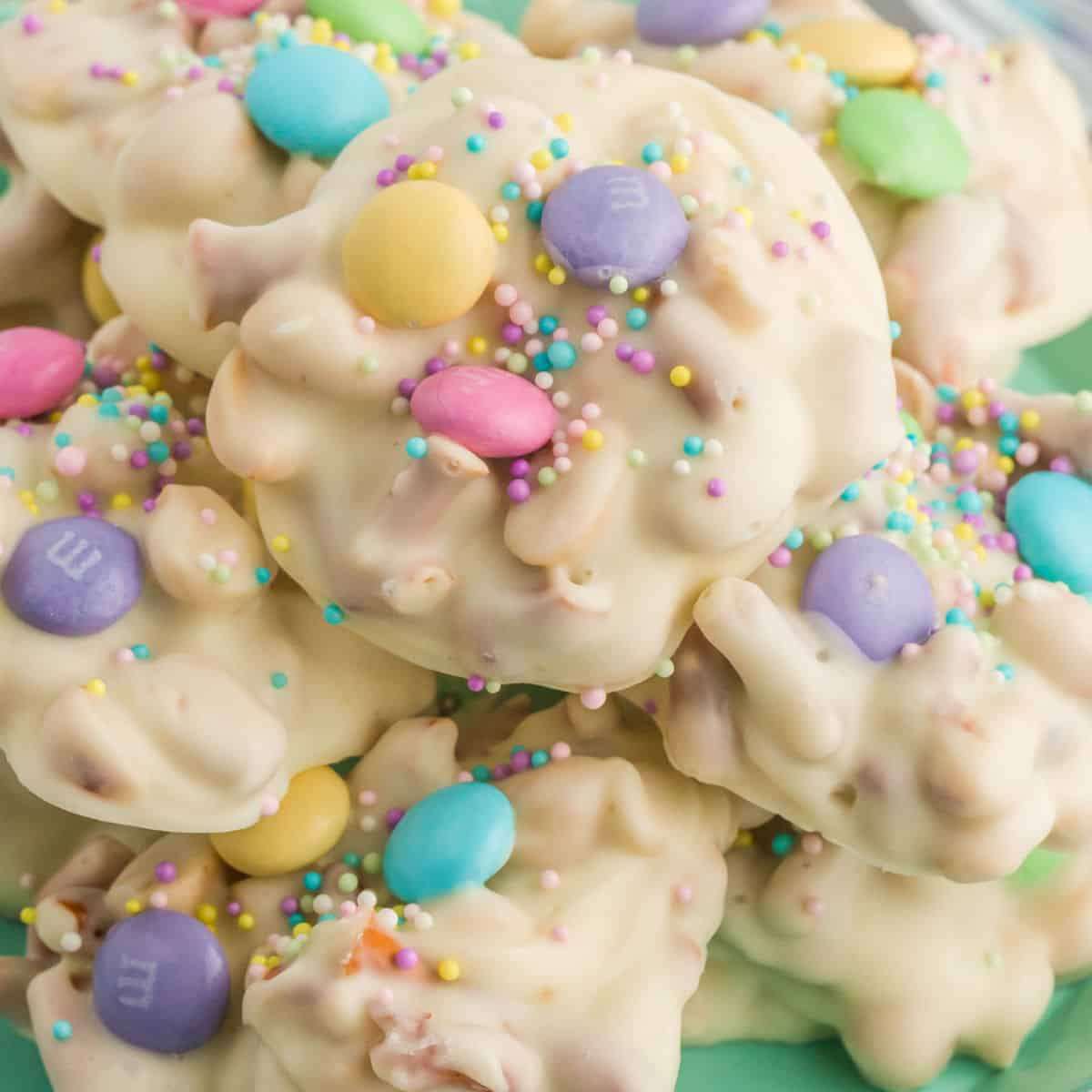 - Drop by spoonfuls (I like to use a small cookie scoop) onto a baking sheet lined with parchment paper or a silicone mat. Top candy clusters with sprinkles and M&Ms while chocolate is still soft. Allow candy to set for at least one hour to set up.