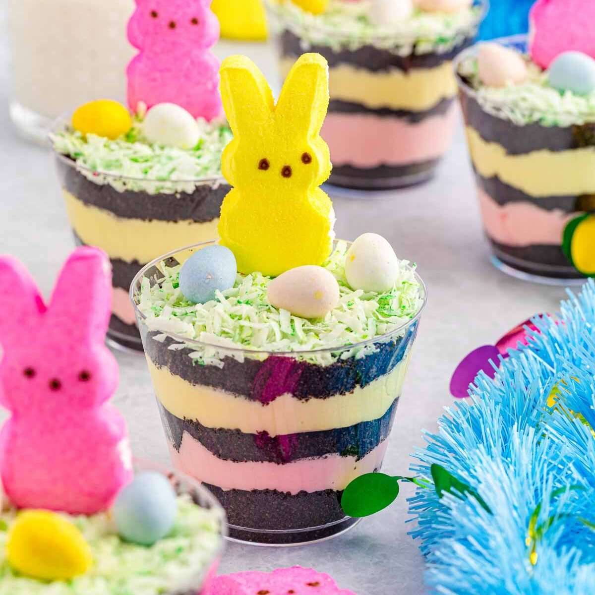 These Easter dirt cups are made up or Oreo dirt crumbs, layers of pudding, and the cutest Easter decorations! They're the perfect Easter treat and a great no-bake Easter dessert for any celebration!