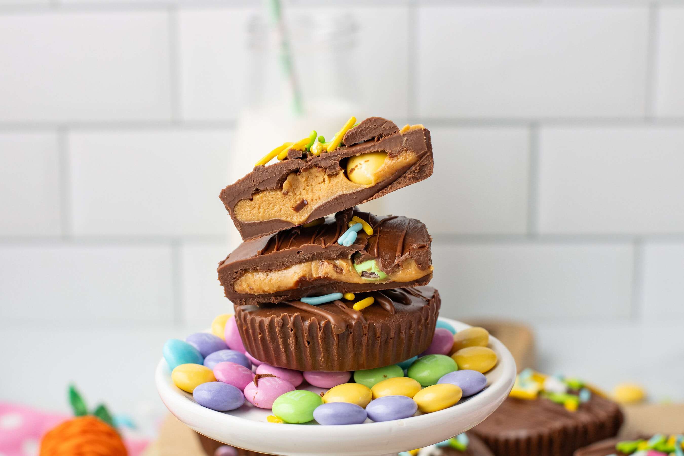 - Drizzle the peanut butter cups lightly with the remaining melted chocolate, and top with Easter sprinkles and/or jimmies.
