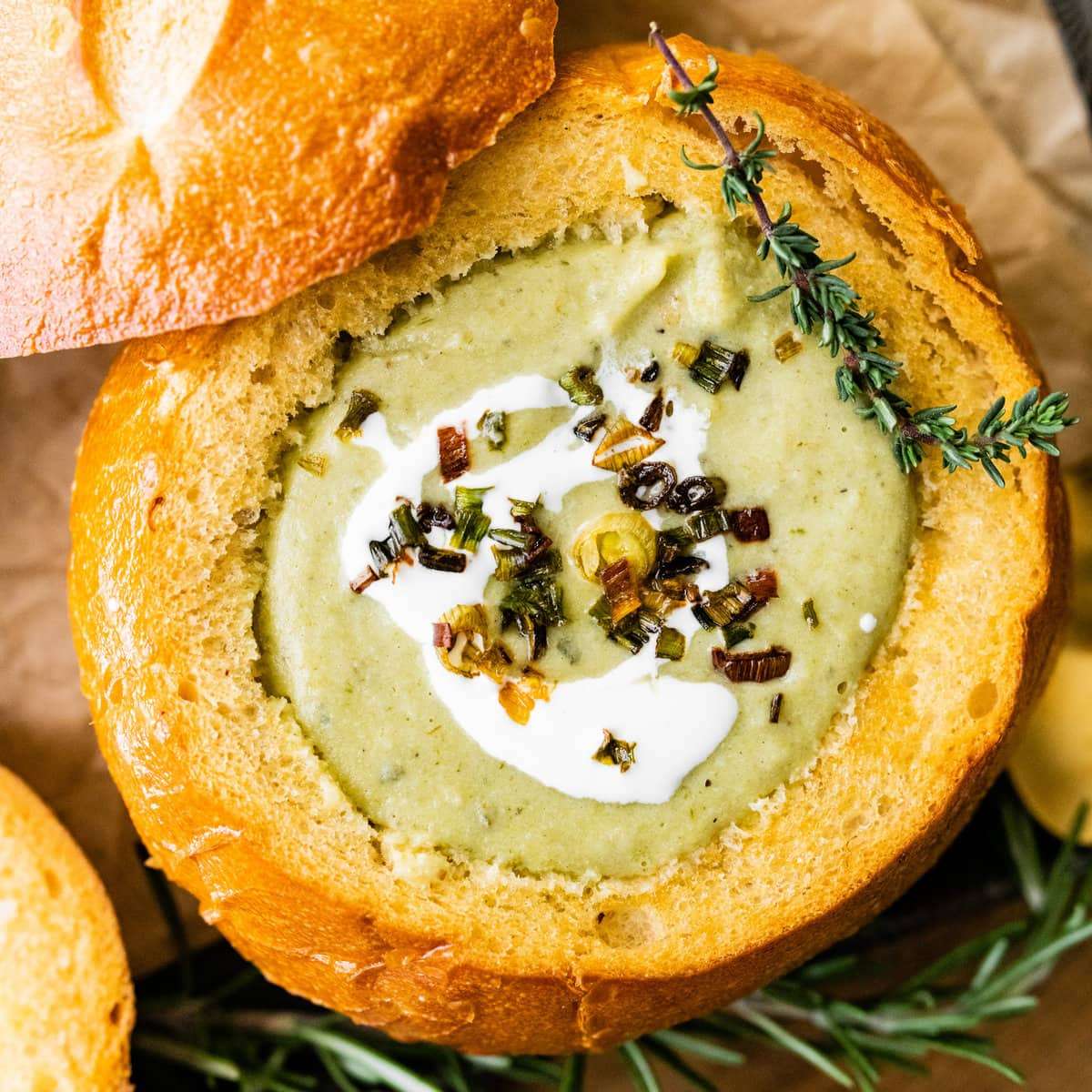 - Serve soup in a bread bowl or with crusty bread, and top with crispy green onions, a swirl of creme fraiche, or coconut cream- if desired. Enjoy hot!