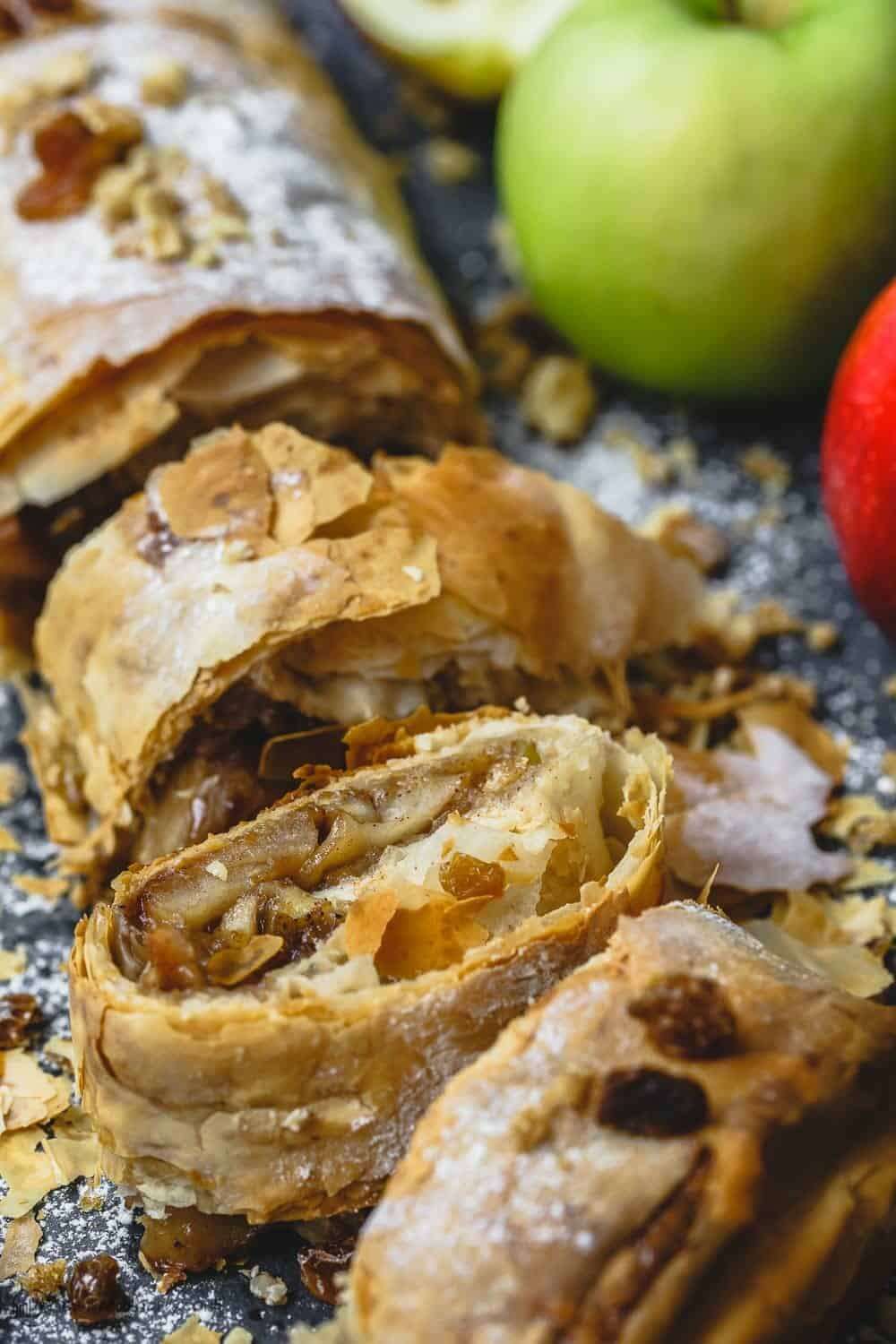 Make the perfect apple strudel! Homemade apple filling in flaky, extra crispy phyllo dough. A light and delicious fall dessert to feed a crowd. Be sure to watch the video above for how to make this apple strudel