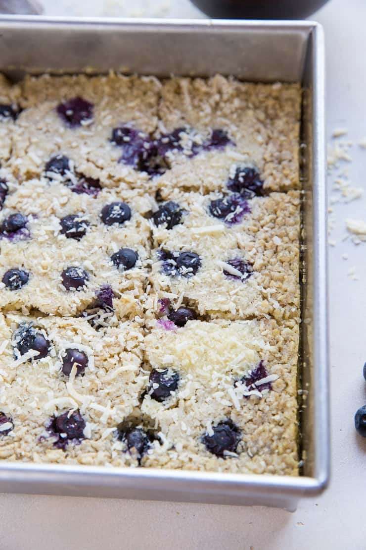 - Transfer the baked oatmeal mixture to the prepared baking pan. Top with any desired ingredients (I do ½ cup fresh blueberries and about ¼ cup unsweetened shredded coconut) and bake 40 to 55 minutes, until baked oatmeal is golden-brown around the edges and set up in the center.