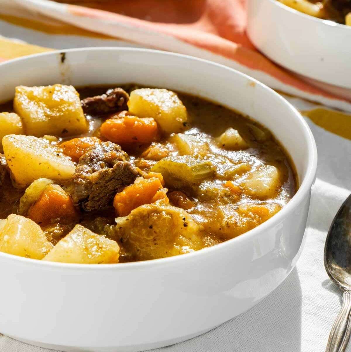 - Add the potatoes, stir, regain the simmer, and simmer for 1 hour, or until the beef and potatoes are tender.