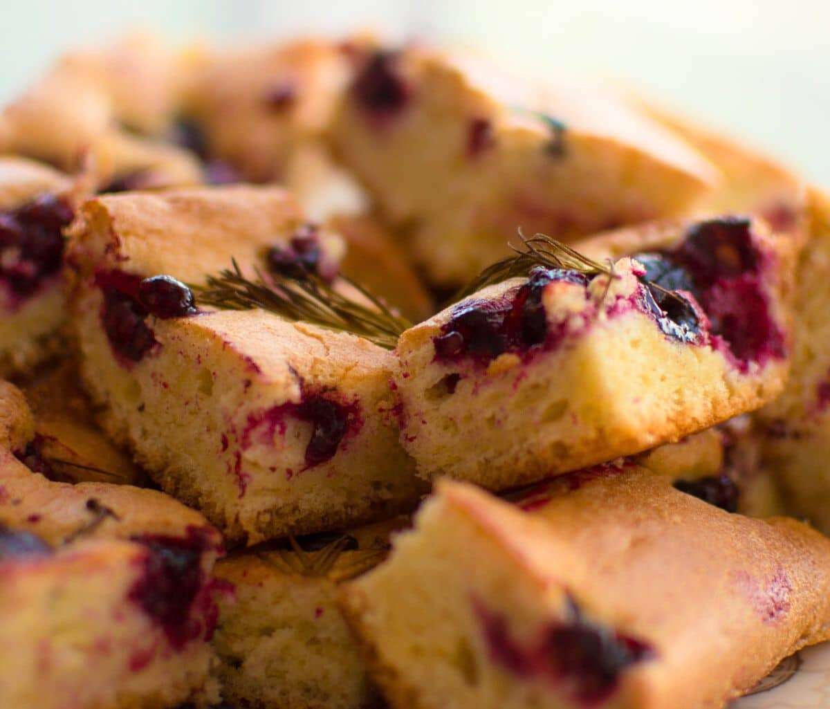 - Pour the dough into a baking dish lined with butter and flour, then sprinkle the currants and fir buds over the dough.