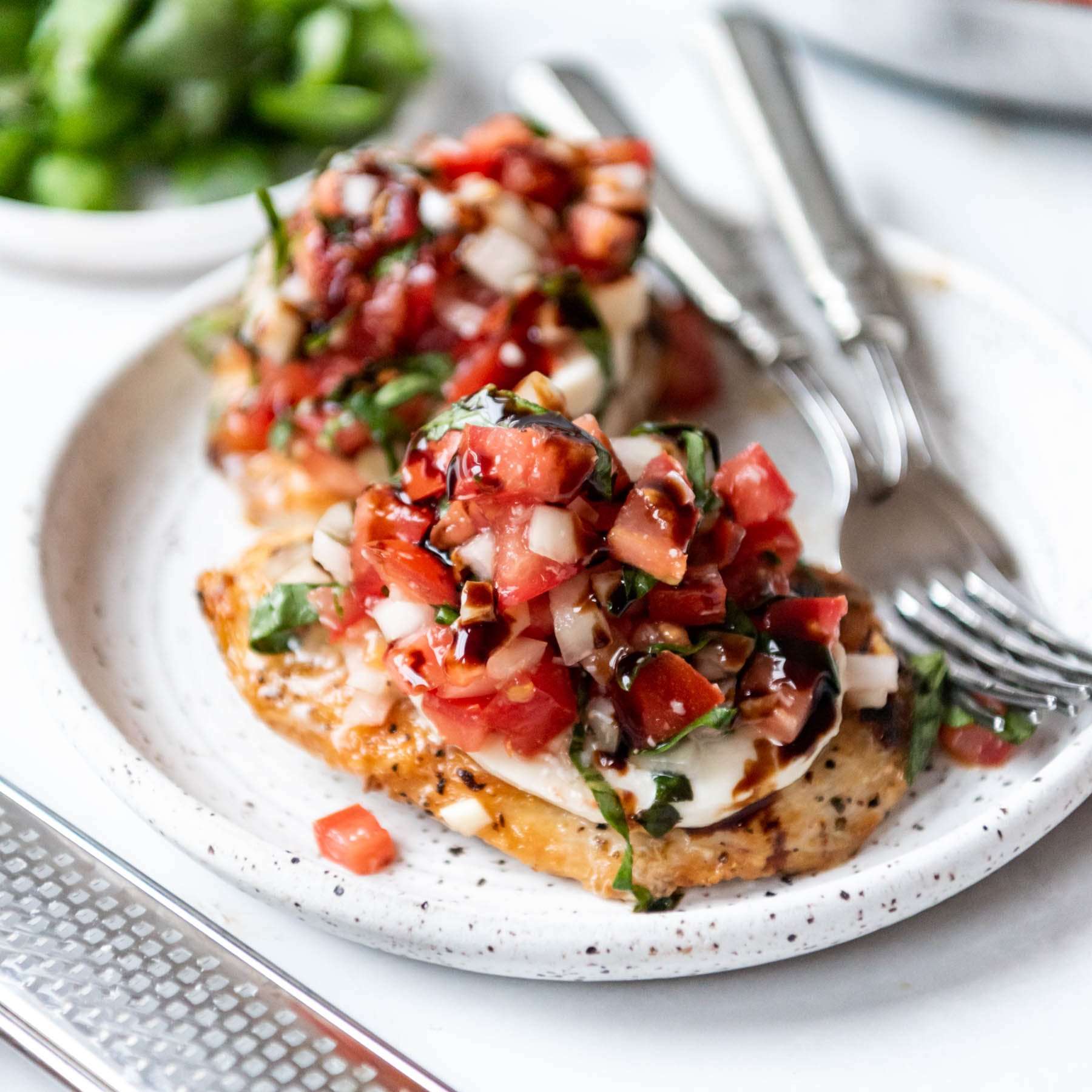 - Top each piece of chicken with a slice of fresh mozzarella cheese, if desired, then spoon a generous amount of the bruschetta mixture over the top of each serving.