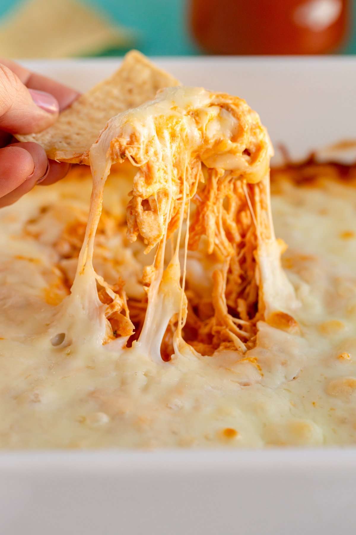 The easiest baked buffalo chicken dip! Cream cheese, buffalo chicken, and ranch dressing are layered together then baked into a creamy, cheesy, and delicious dip!