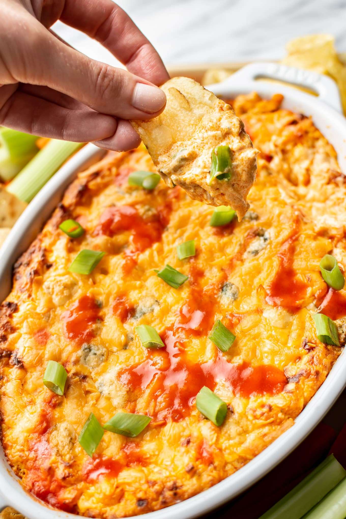 - Top with scallions if using. Serve the dip hot with baguette slices, celery/other veggies and/or crackers/chips.