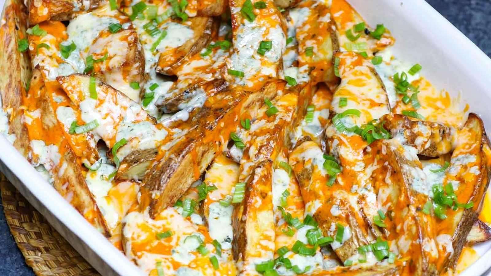 - Remove the buffalo fries from the oven. Garnish with green onions and serve warm.