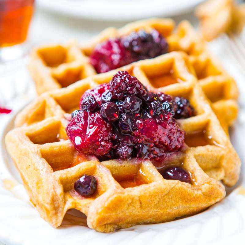 - Carefully remove waffles, place on serving plate, and top with mixed berry preserves. Optionally, dust with confectioners’ sugar, serve with maple syrup, or with your favorite waffle topping.