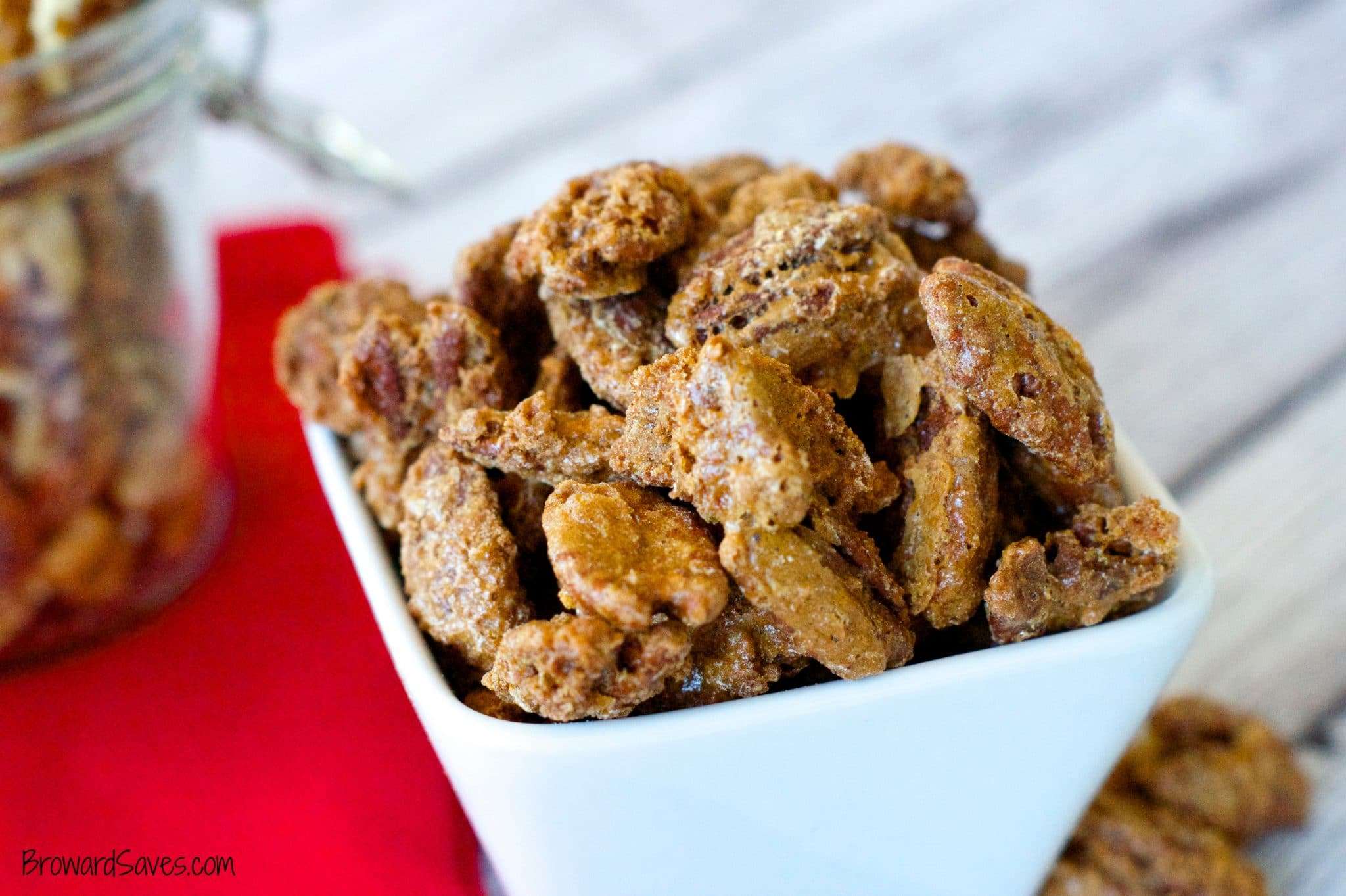 Super Easy Candied Pecans Recipe - Pecans are baked using a cinnamon sugar mixture. Great snack for entertaining and a topping for salads and other dishes.