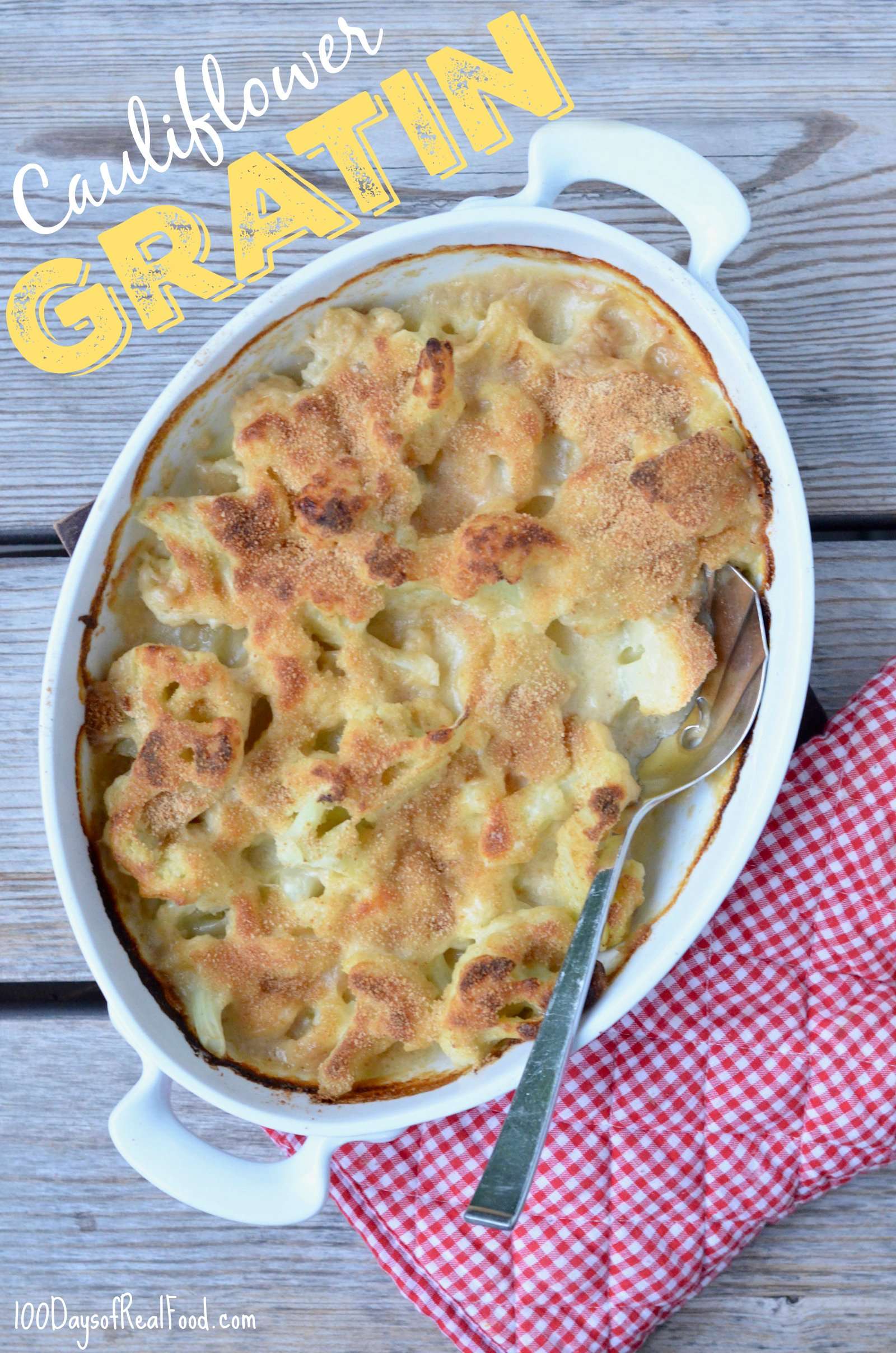- Nutrition Facts Easy Cauliflower Gratin Amount Per Serving Calories 243 Calories from Fat 144 % Daily Value* Fat 16g25%Saturated Fat 10g63%Cholesterol 46mg15%Sodium 592mg26%Potassium 527mg15%Carbohydrates 16g5%Fiber 4g17%Sugar 6g7%Protein 13g26% Vitamin A 500IU10%Vitamin C 68.7mg83%Calcium 305mg31%Iron 1.2mg7% * Percent Daily Values are based on a 2000 calorie diet.