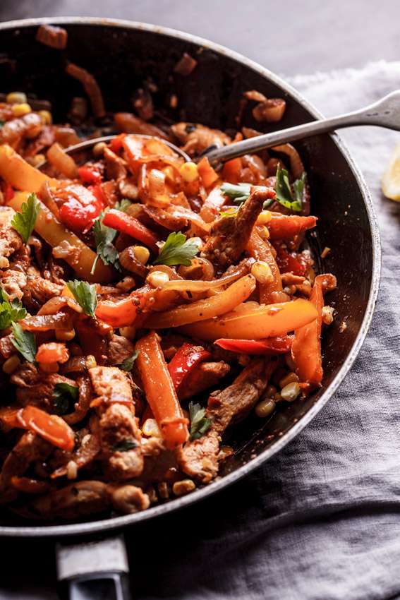 Quick and easy chicken fajitas made with sweet bell peppers, onions and roasted sweet corn with avocado cream.