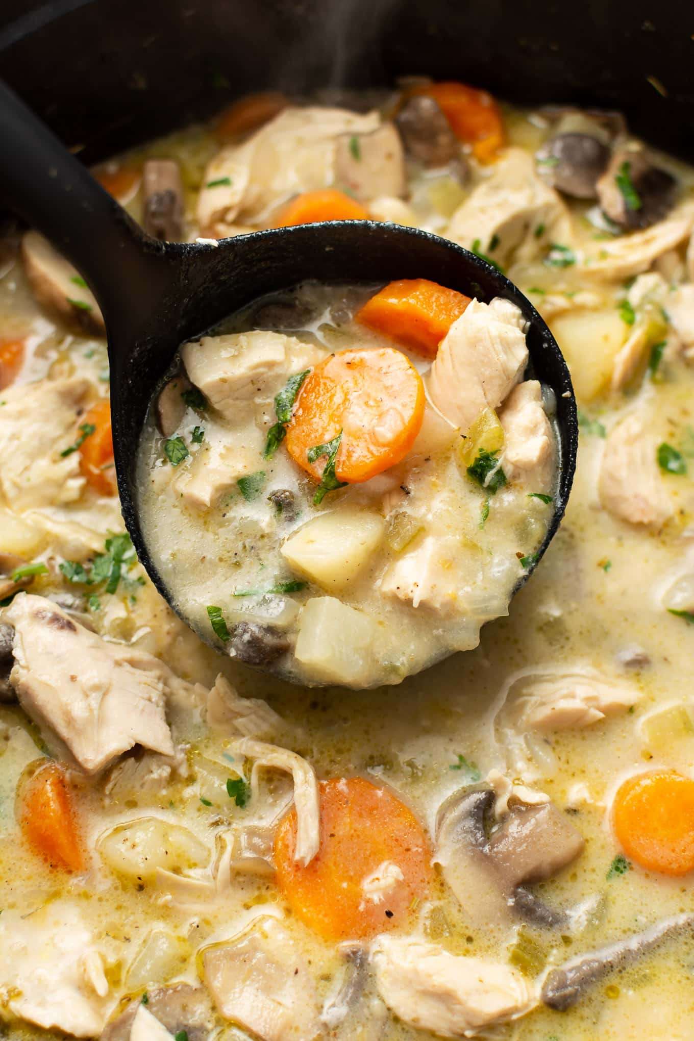 - Stir in the chicken broth and ensure the flour has dissolved, then add in the cream, Italian seasoning, mushrooms, potatoes, and chicken.