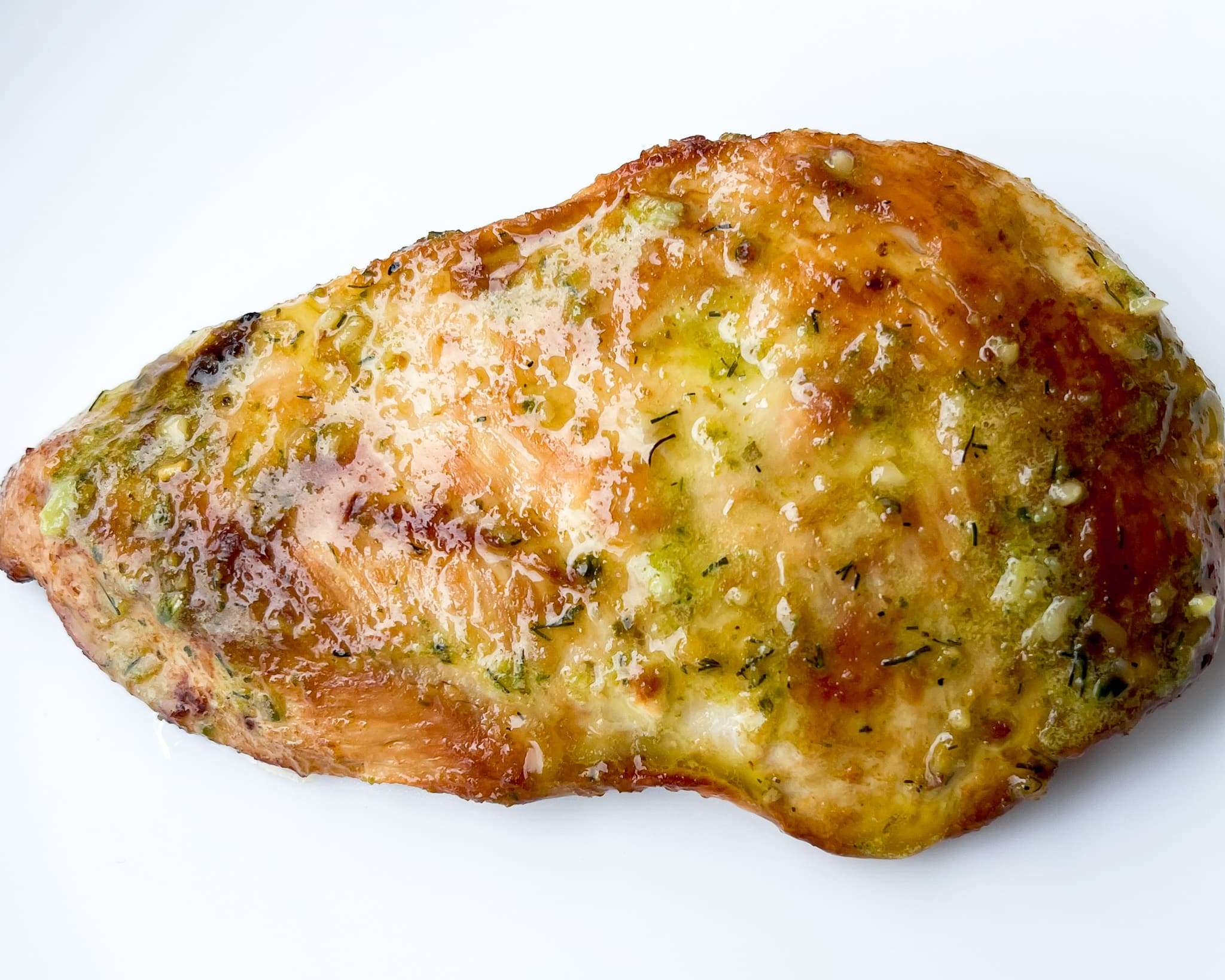 - When the chicken is almost ready, spread a generous layer of pesto butter onto each piece. If you're using frozen butter, be patient; it will melt beautifully as the chicken finishes cooking. You can help it melt faster by moving it around a bit on top of the chicken to help it along.