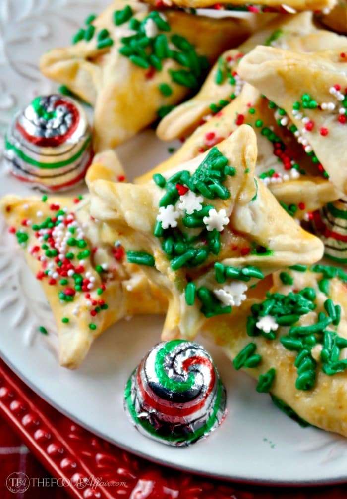 - Place a piece of chocolate in the center of each dough and fold the dough to the center and pinch the sides together. Gently brush each cookie with egg and add colorful jimmies. Bake for 25 minutes or until lightly browned.