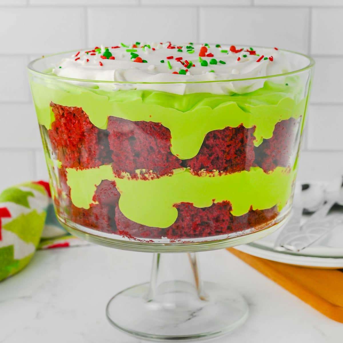 This Christmas Trifle recipe is a wonderful holiday dessert that is made with layers of red velvet cake, green pudding, and simple whipped topping with holiday sprinkles on top.
