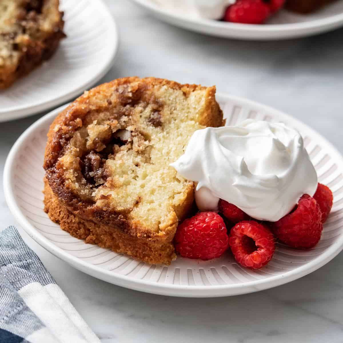 This bundt-style coffee cake makes for a delightfully decadent breakfast, sweet afternoon treat, or simple dessert. Made with baking mix, this easy coffee cake recipe is simple to throw together and the sweet ribbon of cinnamon streusel is the best part!