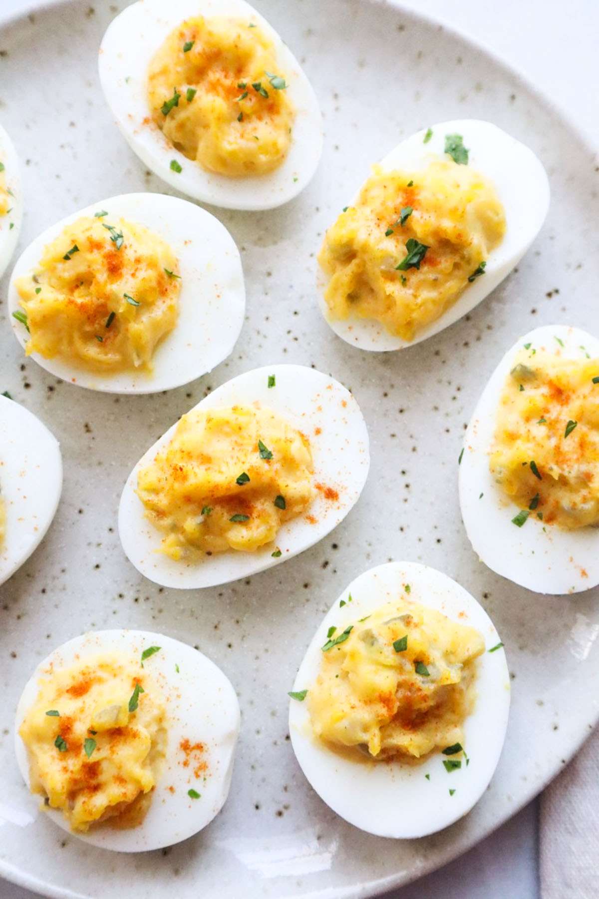 Dairy-Free Deviled Eggs are creamy, tangy, and flavorful, made with dairy-free mayo, sweet relish, and Dijon mustard—a perfect holiday appetizer!