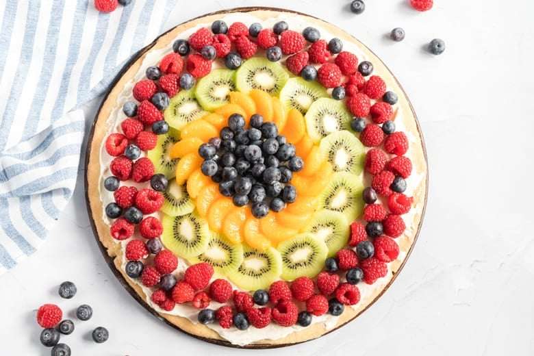 This Dessert Pizza with fresh fruit, cream cheese frosting and a crispy cookie base is a fun and tasty treat the whole family will go crazy for!