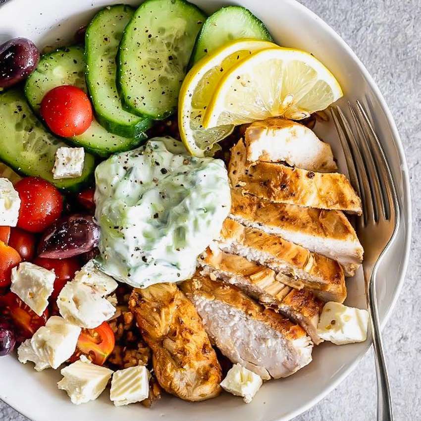 This easy Greek chicken grain bowl is the perfect meal prep recipe and makes a delicious, healthy and filling lunch served with creamy tzatziki sauce.