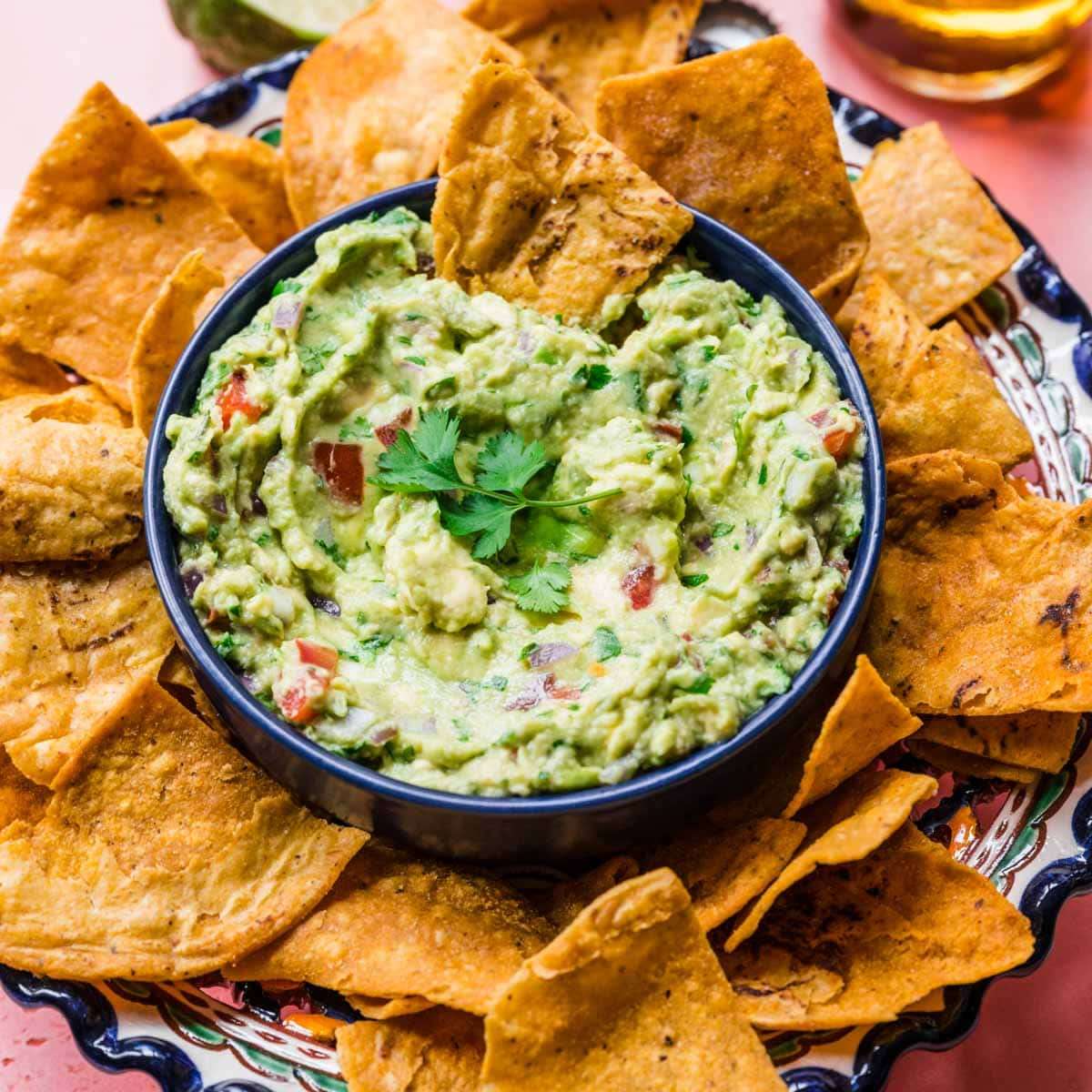 Easy Guacamole recipe for the perfect dip for tortilla chips with fresh avocados, tomatoes, cilantro, lime, and red onion ready in 5 minutes.