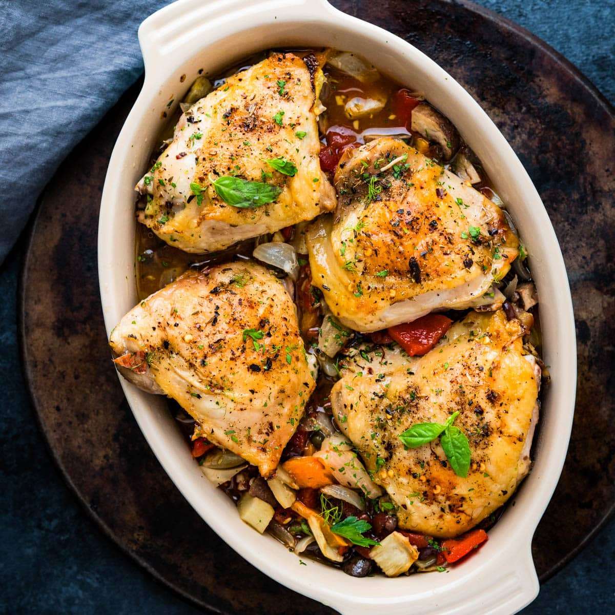 - Pour the wine mixture over the vegetables in the pan and mix to combine. Spread the vegetables out into a single layer and top with the chicken thighs and any juices that have collected on the plate.