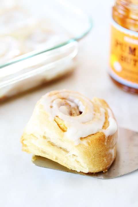Mini cinnamon rolls made with pumpkin butter and cream cheese frosting! The best part? They take less than 30 minutes to make!