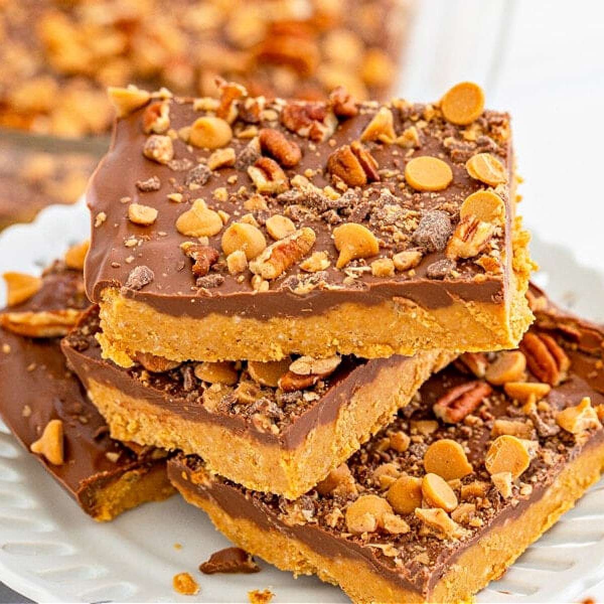 - Sprinkle pecans, peanut butter chocolate chips and Heath or Skor bits all over top of the chocolate layer. Refrigerate for at least an hour.