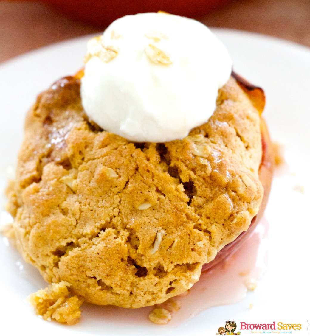 - Place peaches in a baking dish. Sprinkle in 1 tb. of Sugar divided in the 4 peaches. Add 1/2 Cup of Water to the baking dish and Bake for 10 minutes