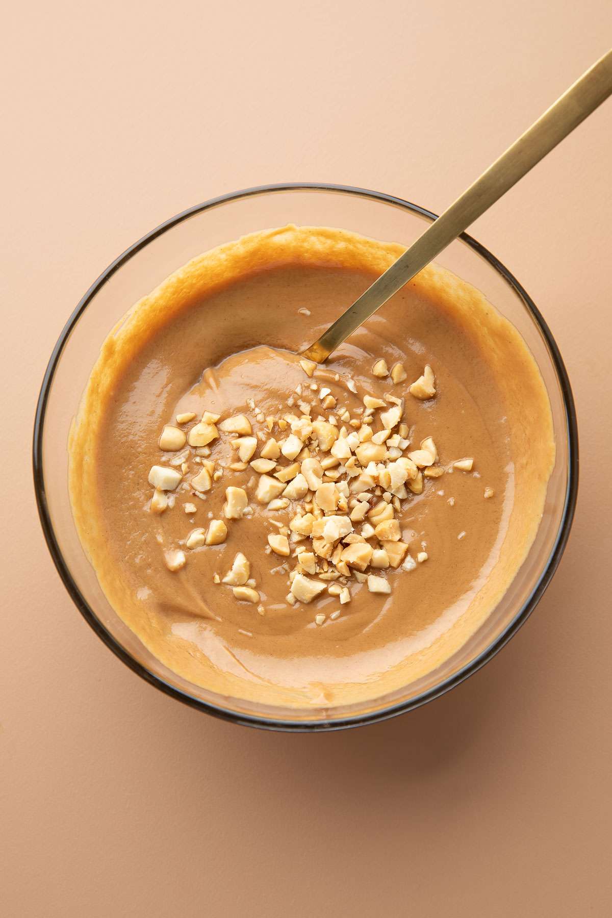 - Add (¼ cup) peanut butter, juice of half an orange or a whole lime, (2 TBSP) soy sauce or GF tamari, (1 TBSP) rice vinegar, (1 TBSP) sesame oil, (1 TBSP) maple syrup, and (2 TBSP) warm water.