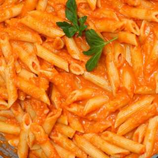 Penne with Roasted Red Pepper Sauce, Pine Nuts, Fresh Tomato, and Feta (Gluten Free)