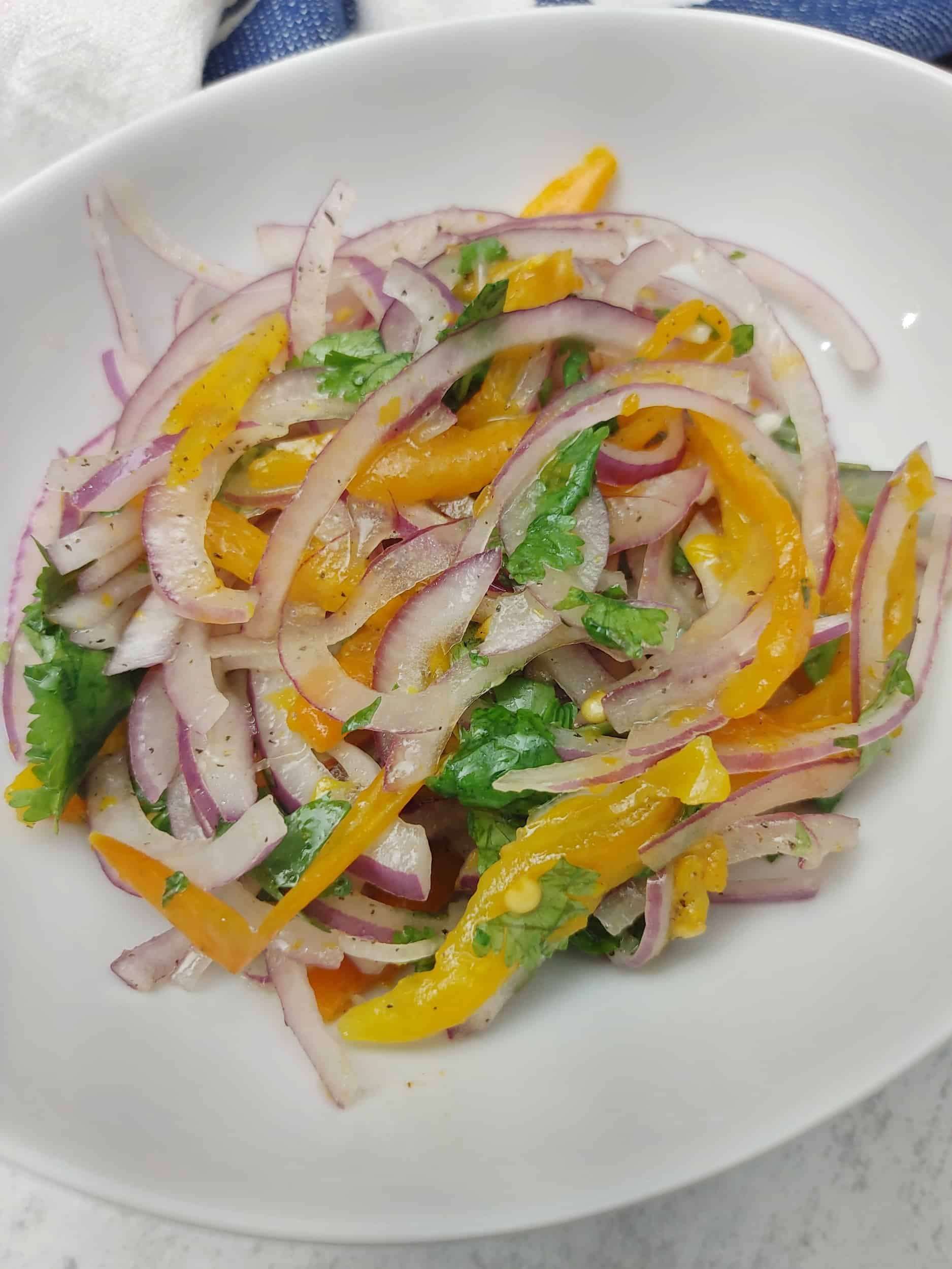 Peruvian Salsa Criolla is a traditional Peruvian sauce made with red onions, lime juice, vinegar, and chili peppers. It is an essential part of Peruvian cuisine characterized by its tangy, slightly sweet, and spicy flavor. It is made by thinly slicing red onions and marinating them in lime juice and vinegar. The mixture is then seasoned with salt and chili peppers, such as ají Amarillo, to taste.