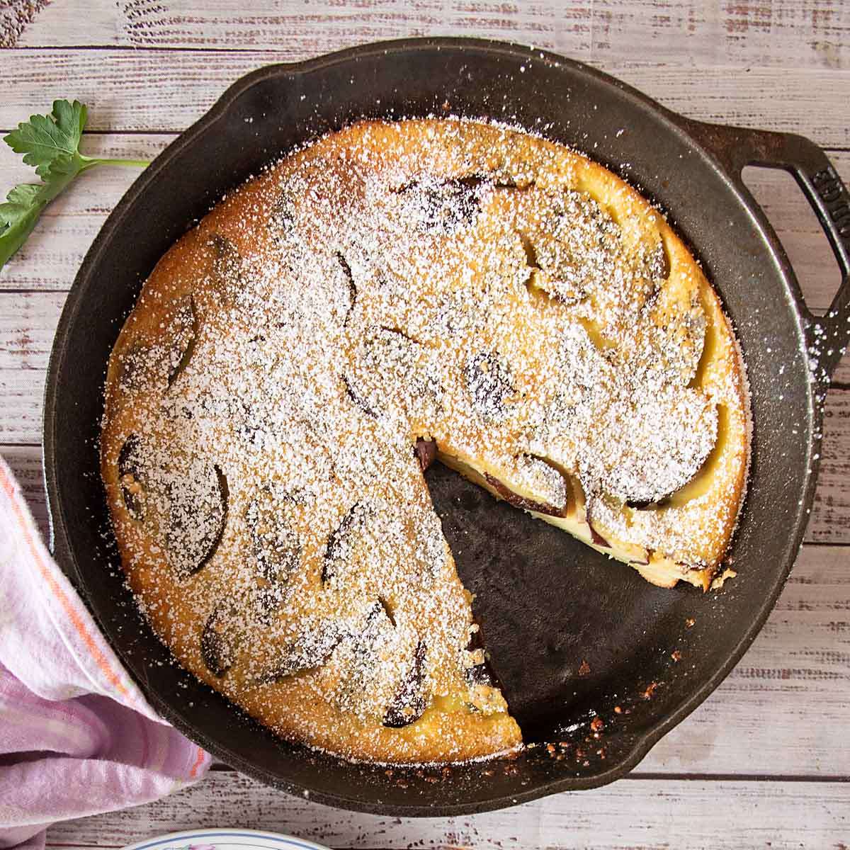 Plum Clafoutis (pronounced klah-foo-TEE) is a dessert or breakfast recipe full of egg custard, fruit and vanilla. Think of a cross between a quiche and a Dutch Baby pancake--yum!