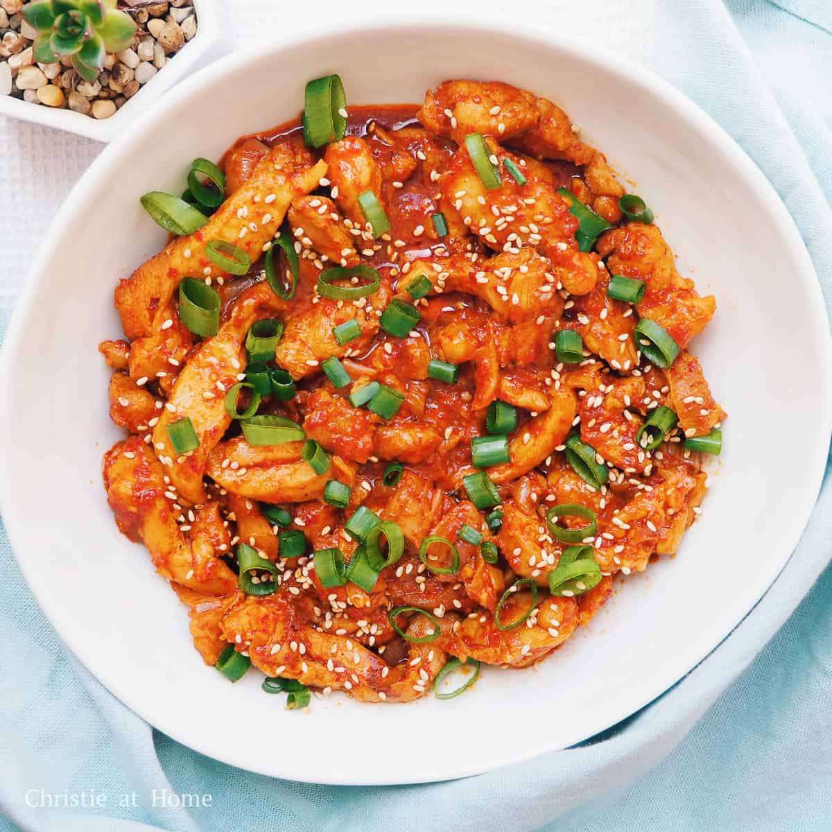 Tender chicken cooked in a spicy, smoky and sweet gochujang sauce! This quick and easy Korean spicy chicken is made with simple ingredients in one-pan! A great main dish ready in 30 minutes for all the chicken-lovers.