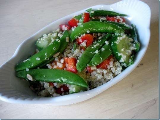 - Chop the carrot, red pepper, cucumber and cilantro. Toss them, along with the sugar snap peas and sunflower seeds with the quinoa.