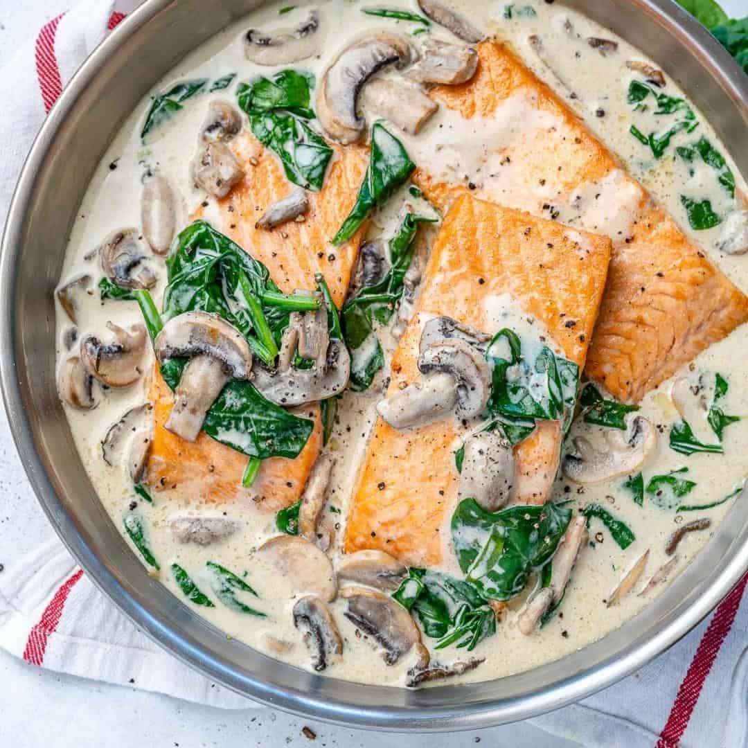 - Return the salmon back to the pan, and spoon the creamy spinach and mushrooms on top. Serve hot and enjoy!