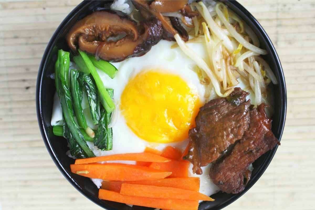 - Place the steamed rice into a bowl and place a fried egg in the center. Arrange the Korean slaw, roasted mushrooms, beef and assorted vegetables around the egg. Top with the prepared bibimbap sauce. Mix the ingredients well and enjoy!