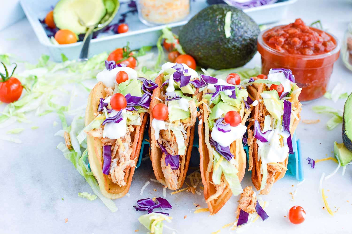 - Once the meat and tortillas are ready, it’s time for the fun part. Use a fork or thongs to add chicken inside the taco shell, then fill with your favorite toppings in any order you choose. We like to set up an “assembly line” on our kitchen counter and let everyone build their own tacos. Cheese, lettuce, sour cream, salsa – whatever you like, however you like. Enjoy!