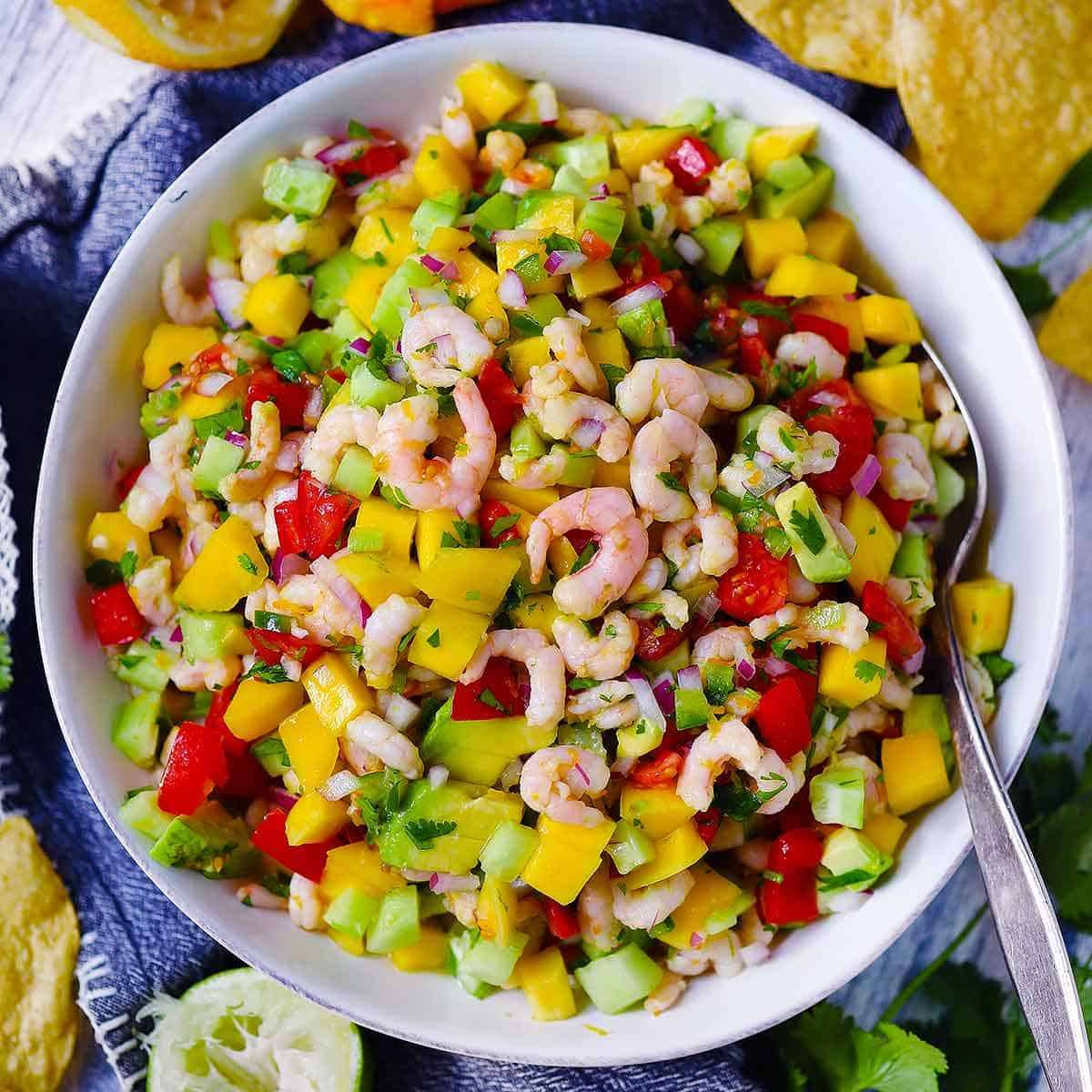 This easy Shrimp Ceviche recipe uses cooked shrimp, for a faster and less expensive version. Served cold, Ceviche is a seafood salad packed with fresh lime flavor and refreshing ingredients for the perfect light summer meal or appetizer! Serve with tortilla or plantain chips, on a lettuce wrap, on a tostada, or with crackers.