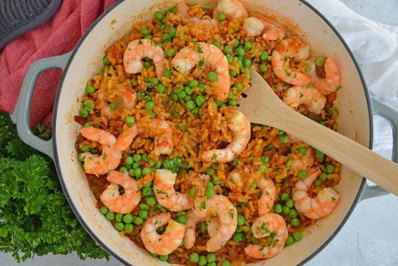Shrimp Paella is an easy, weeknight meal requiring less than 10 ingredients, one pan and 30 minutes—all due to one secret pantry staple!