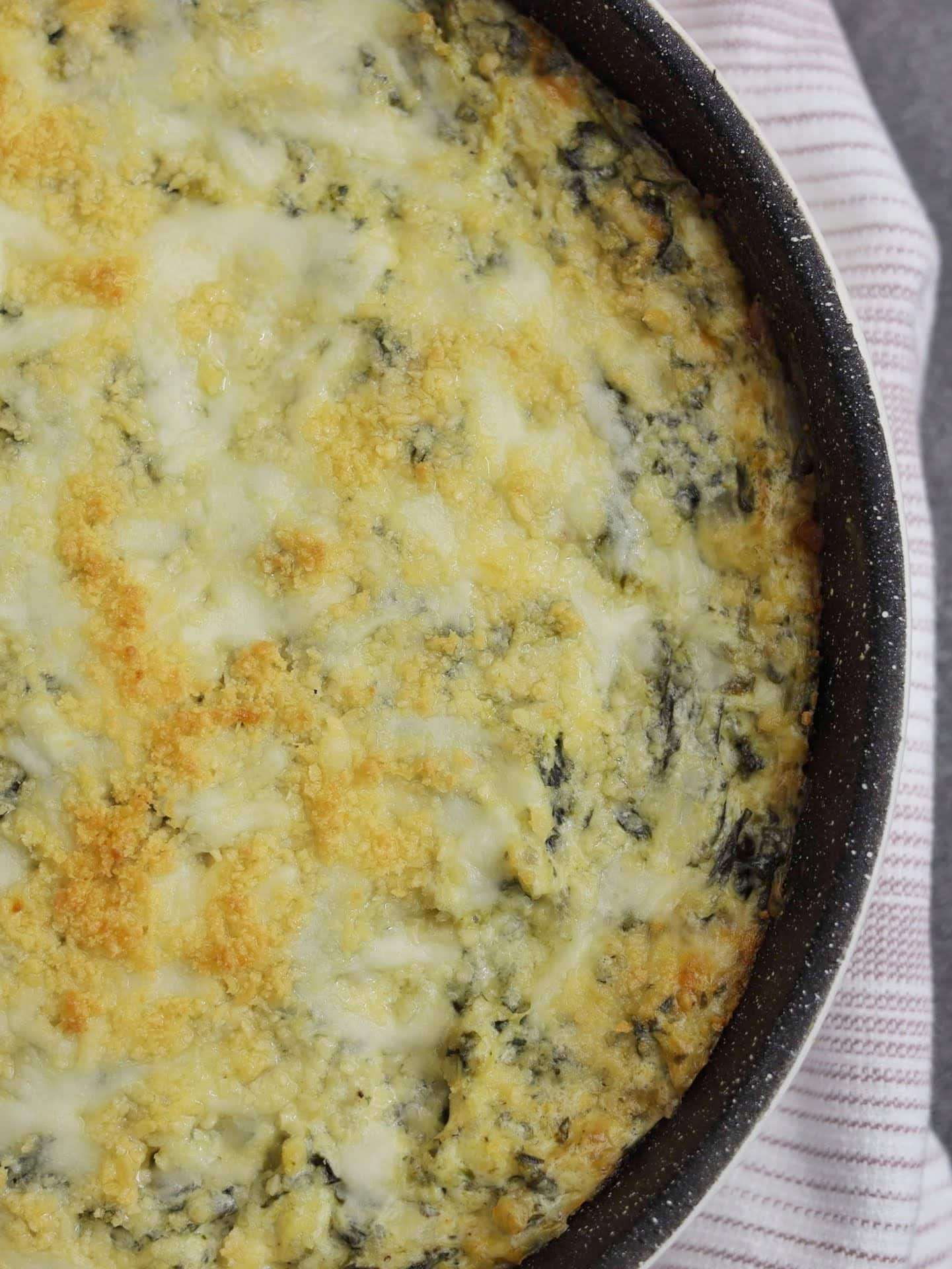 - Bake the Dip: Transfer the mixture to the prepared baking dish. Top with the reserved Parmesan and Mozzarella cheese mixture. Bake until the edges are browned and bubbly, about 20 to 25 minutes.