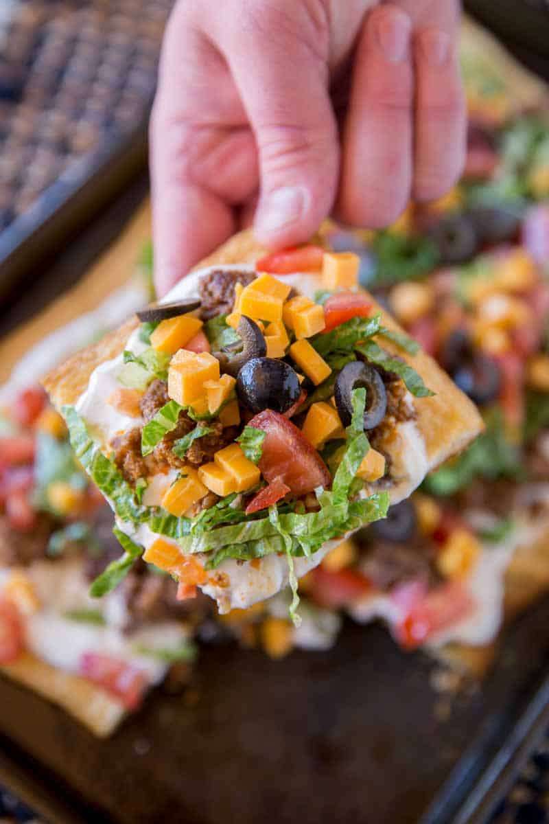 - Layer the pizza with sour cream, taco meat, lettuce, tomato, cheddar cheese and olives.