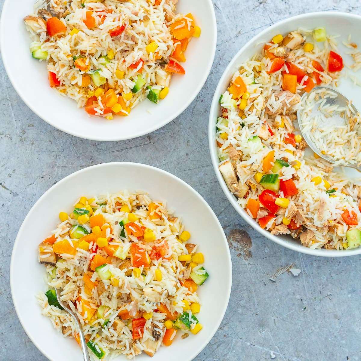 - Chop up all the vegetables into small pieces and put in a large bowl, add the tuna and sweetcorn and the cooled drained rice and stir well to combine