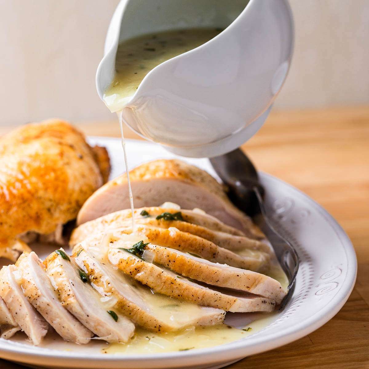 Easy turkey gravy made with pan drippings and stock, white wine, sage, onion, and cornstarch in 20 minutes or less.