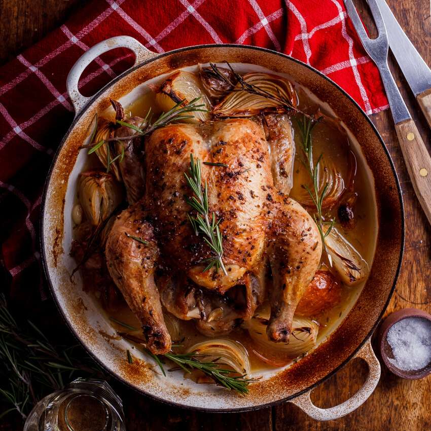 Succulent roast chicken flavored with fresh rosemary, garlic and lemon and cooked with white wine. So easy and absolutely delicious.