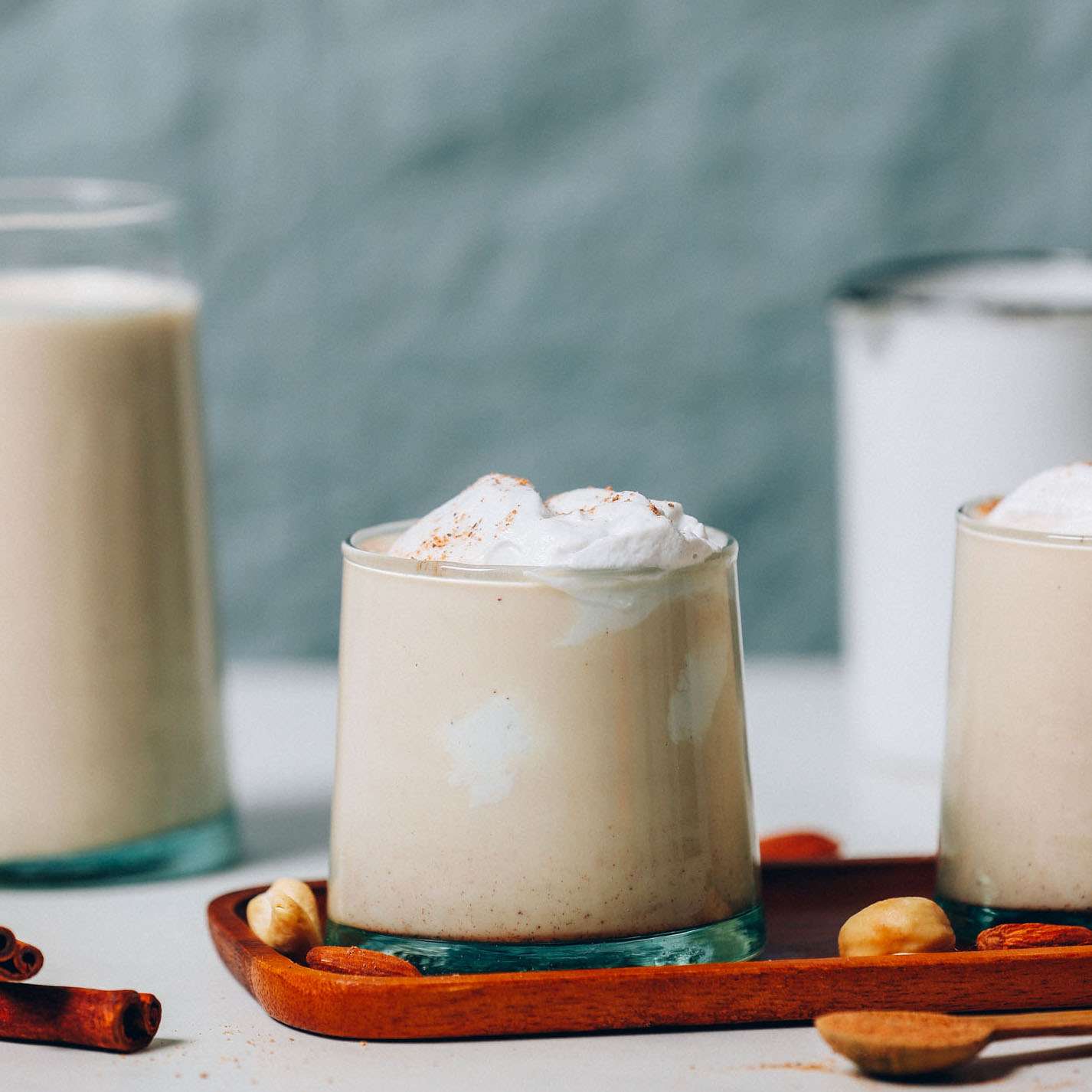 - *Nutrition information is a rough estimate calculated with unfortified cashew milk, the lesser amount of maple syrup, and without optional ingredients.*Prep time does not include making dairy-free milk. If making your own dairy-free milk, allow time for soaking, draining, and mixing.*We also had success using this eggnog (bourbon / alcohol omitted) as a base for Golden Milk and our Matcha Latte. Because it's thicker than your average dairy-free milk, we recommend slightly diluting with water for best results.